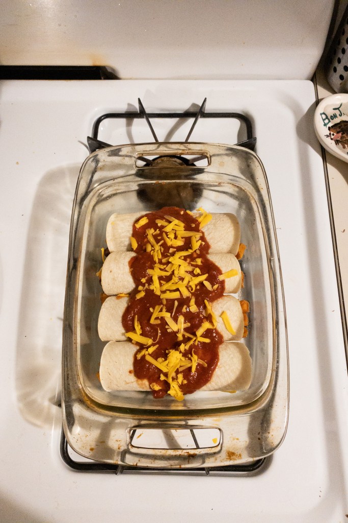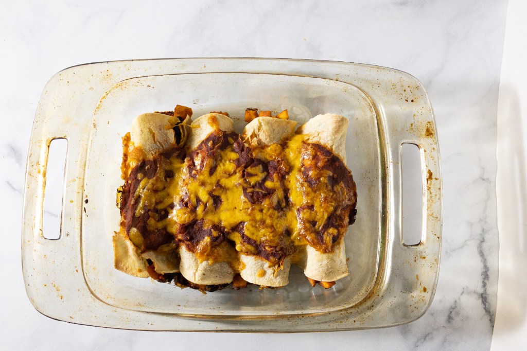 - Scoop 2-3 spoonfuls of the sweet potato/black bean mixture into each tortilla, add a sprinkling of cheese, and fold the two sides in and flip each enchilada over and tuck into a lightly greased baking sheet. See photos for roll reference!