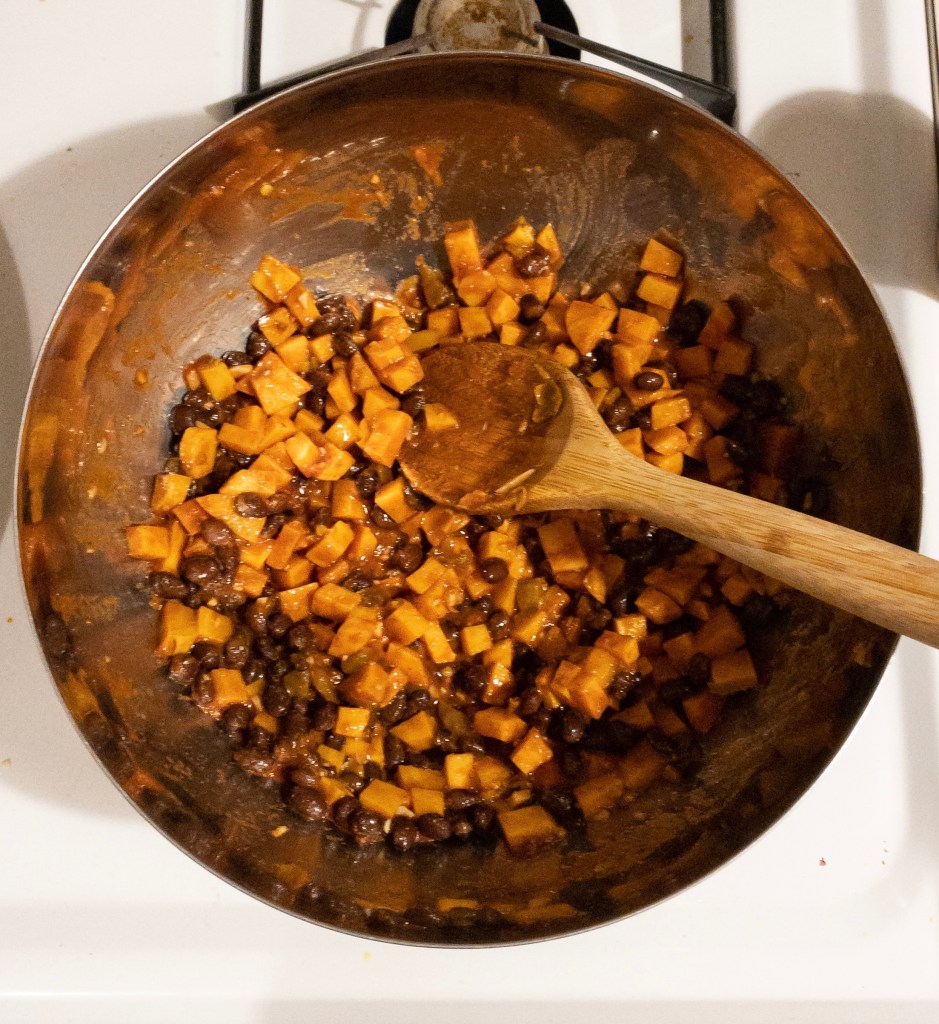 - Take the potato mixture off the burner and mix in the black beans and one cup of the sauce until completely combined.