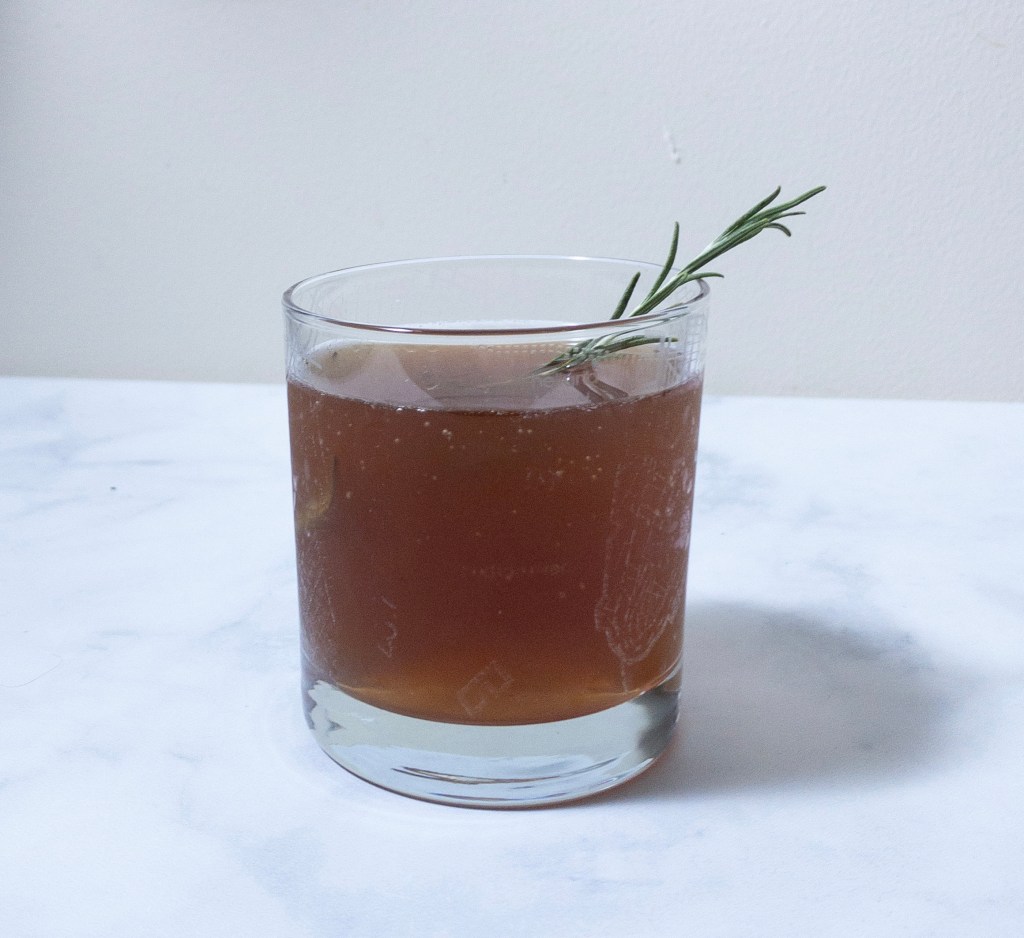 - Shake the cocktail with ice and garnish with a sprig of rosemary
