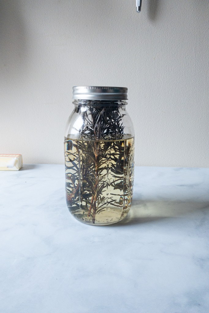 - Add the vodka and a handful of rosemary to a tight-sealing jar.